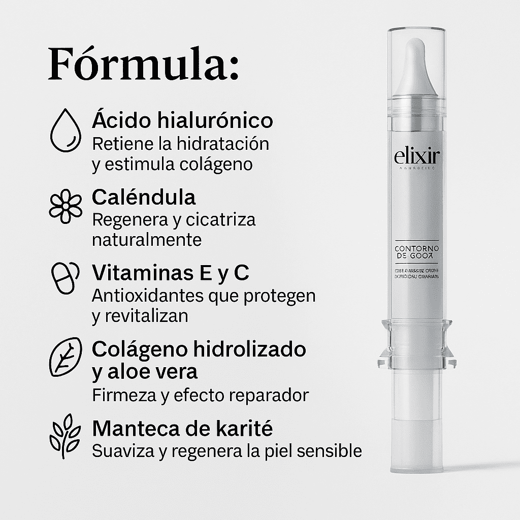 Modo de uso: Aplica una pequeña cantidad en la mañana y noche sobre el contorno limpio. Masajea suavemente con la yema del dedo o el aplicador.