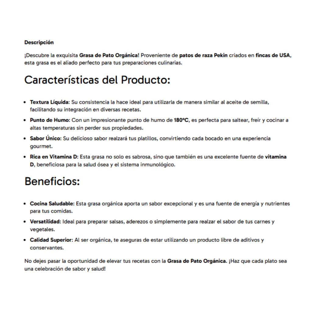 La Grasa de Pato Grassana proviene de patos de raza Pekin criados en libertad y sin antibióticos en fincas de EE.UU. Es una fuente saludable de grasa tradicional, ideal para quienes buscan cocinar con ingredientes reales, sabrosos y sin procesar.