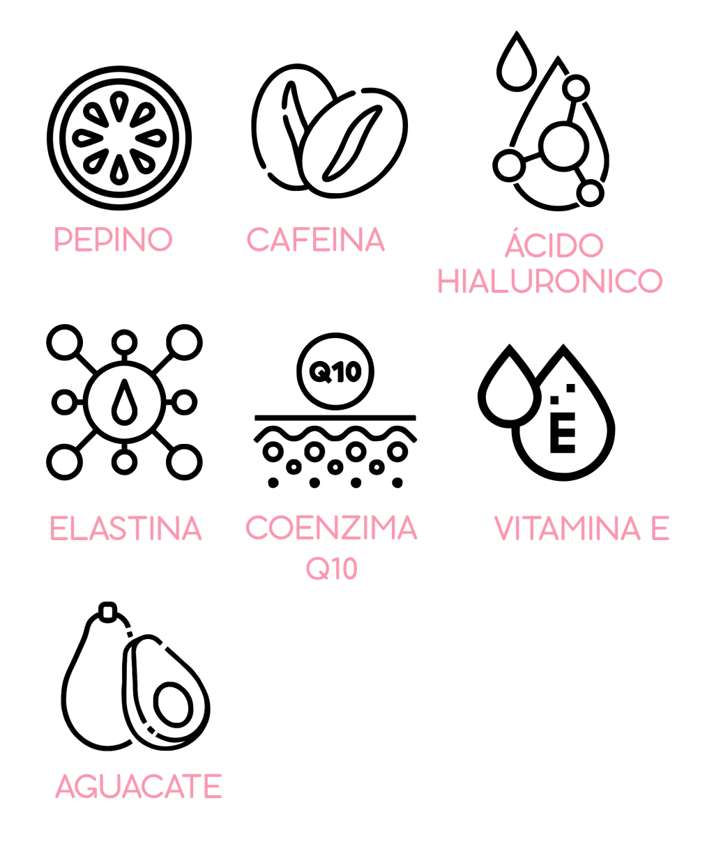 Este sérum ligero está diseñado para cuidar la zona más delicada del rostro: el contorno de ojos. Con ingredientes como extracto de pepino, cafeína, elastina, ácido hialurónico y Q10, ayuda a desinflamar, hidratar y prevenir signos de envejecimiento, como arrugas, bolsas y ojeras.