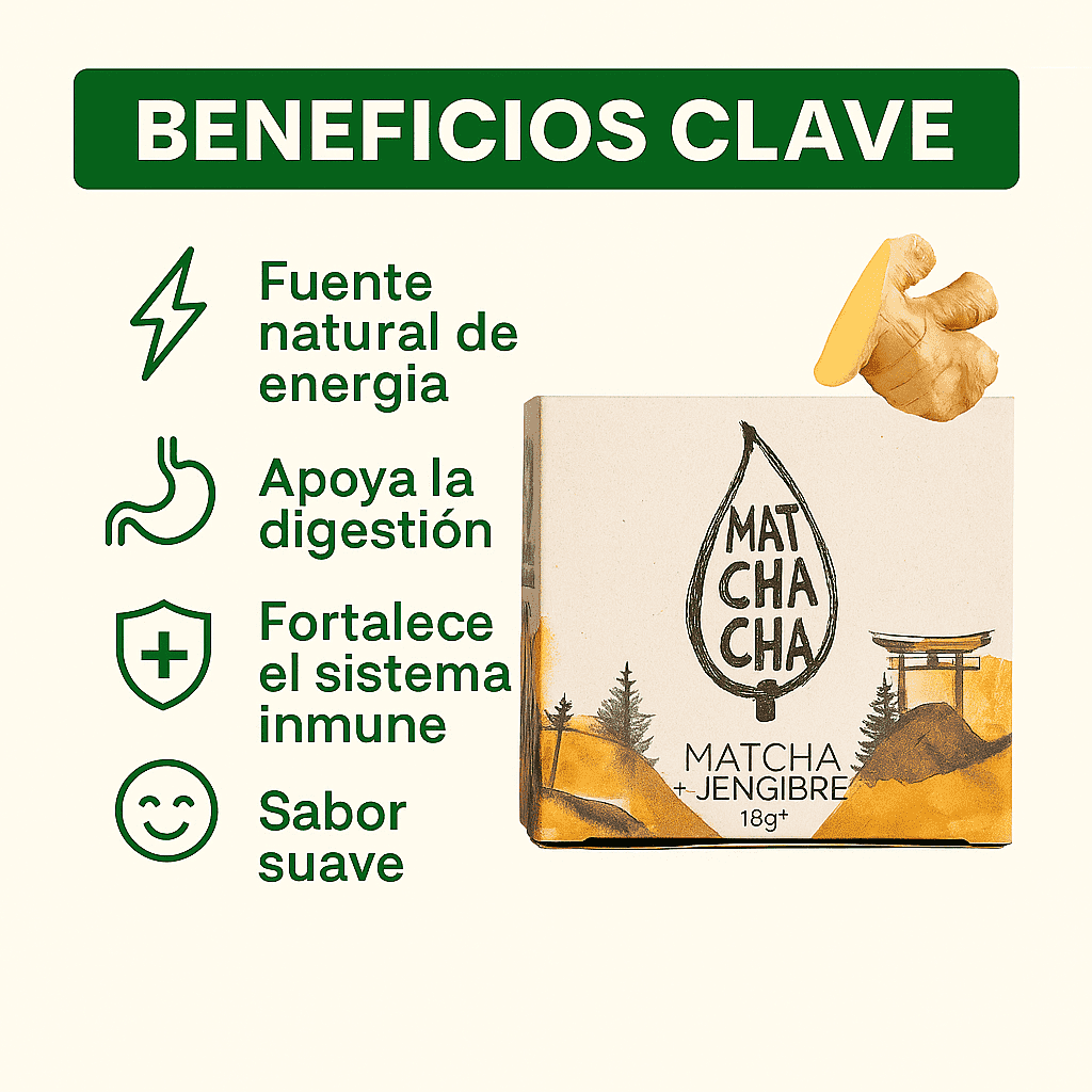 Esta mezcla de matcha con jengibre es perfecta si estás empezando a incorporar este superfood a tu vida. El jengibre suaviza el sabor intenso del matcha y aporta propiedades digestivas, antiinflamatorias y energizantes. Una combinación poderosa y deliciosa, en un formato ultra práctico para llevar contigo a todas partes.